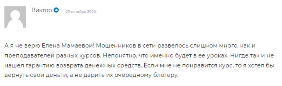 - Жалобы клиентов на то, что Елена Мамаева может быть мошенницей. Отсутствие документов и других подтверждающих факторов заставляет сомневаться пользователей в правдивости слов преподавательницы.
