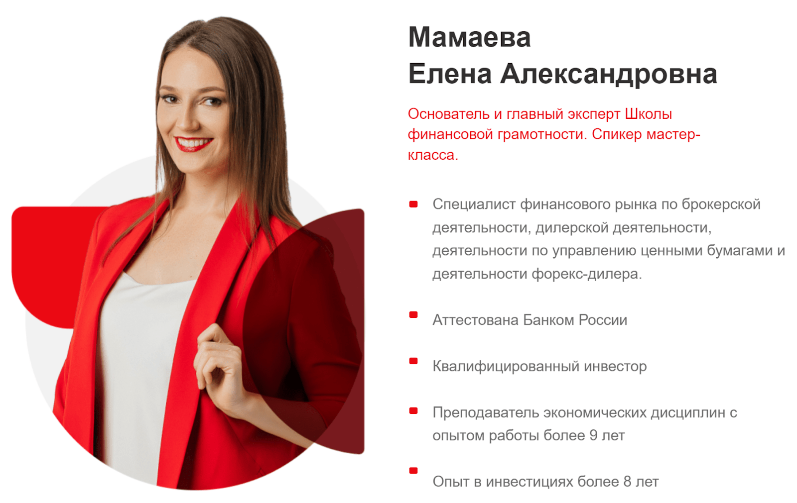 Трейдер Елена Мамаева ведет курсы по финансовой грамотности, заработку на инвестициях в фондовый рынок, она обучает людей получать пассивный доход. Инвестор и преподаватель демонстрирует себя как опытного человека, который разбирается в юриспруденции, финансах и педагогике, так как имеет три высших образования.