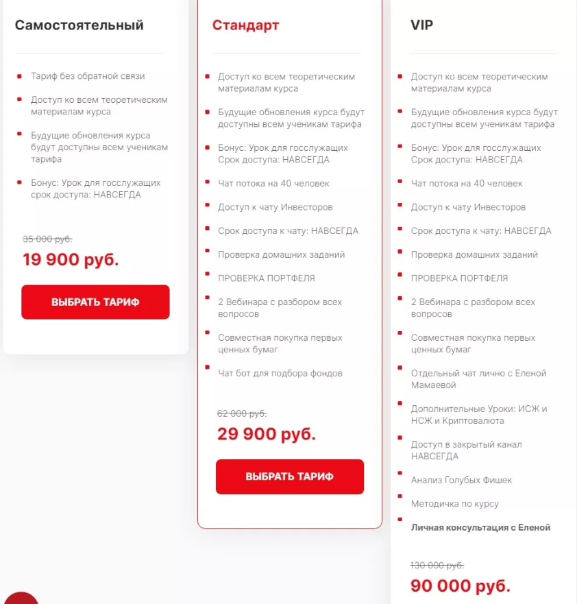 Основной темой обучения являются инвестиции, админ MamaevaFinance com рассказывает как вкладывать деньги в облигации и акции, рекомендует изучать налогообложение и преподает уроки по этой теме на более занятиях в самом дорогом тарифном плане.