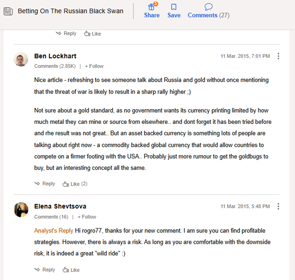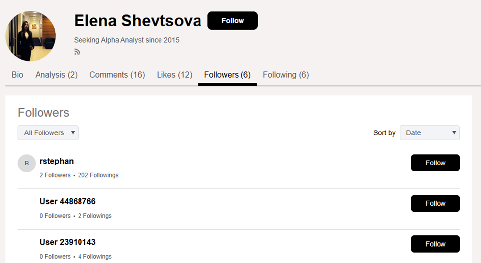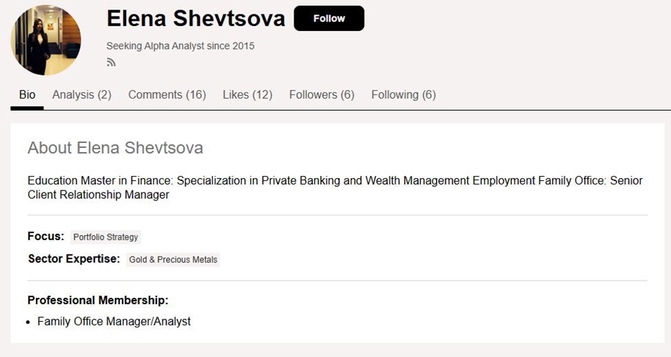 Деятельность эксперта не освещена в Телеграмме или других социальных сетях. Познакомиться с аналитическими работами Елены можно только на платформе Seeking Alpha Com. Профиль зарегистрирован в 2015 году и привлек всего 6 подписчиков.