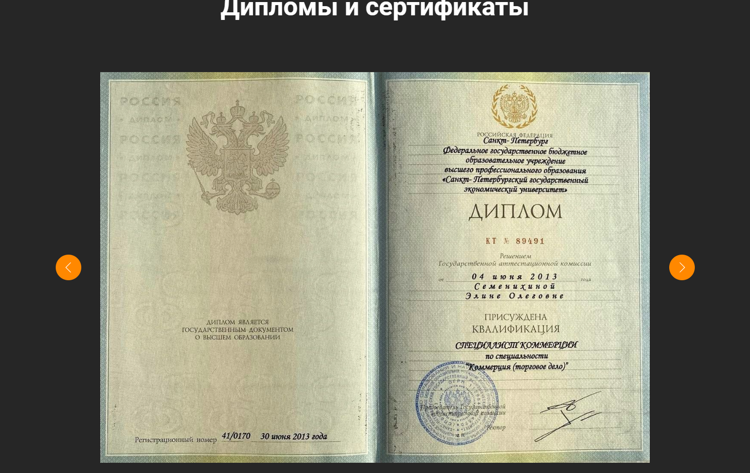 На сайте размещены сканы дипломов, подтверждающих квалификацию автора Элишка. Но из них только один относится к высшему образованию по направлению «Коммерция (торговое дело)». Остальные документы выданы в рамках краткосрочных курсов частных образовательных организаций. Что касается практических успехов Elinatrade, то они ничем не подтверждены. Свой инвестиционный портфель она не показывает.