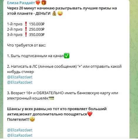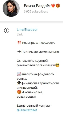 Елиза также организовывает мнимые розыгрыши на несколько сотен тысяч рублей. Для участия якобы надо подписаться на ее канал и написать ей в личные сообщения. Однако победители никогда не объявляются. И реальные выплаты не производятся.
