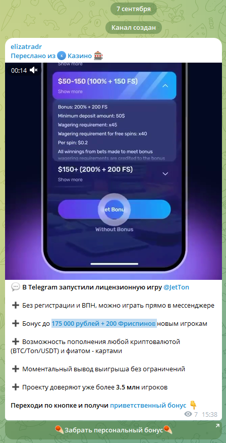 На момент проведения нашей проверки весь контент с Телеграм-канала Elizatradr удален. Осталось одно сообщение, в котором девушка рекламирует онлайн-игру @JetTon. Новым участникам она предлагает 175 000 рублей + 200 Фриспинов. В этой игре пользователи обязательно сливают деньги, поскольку так настроен алгоритм. Заработать можно только небольшую сумму. Но и ее вывести не удастся.