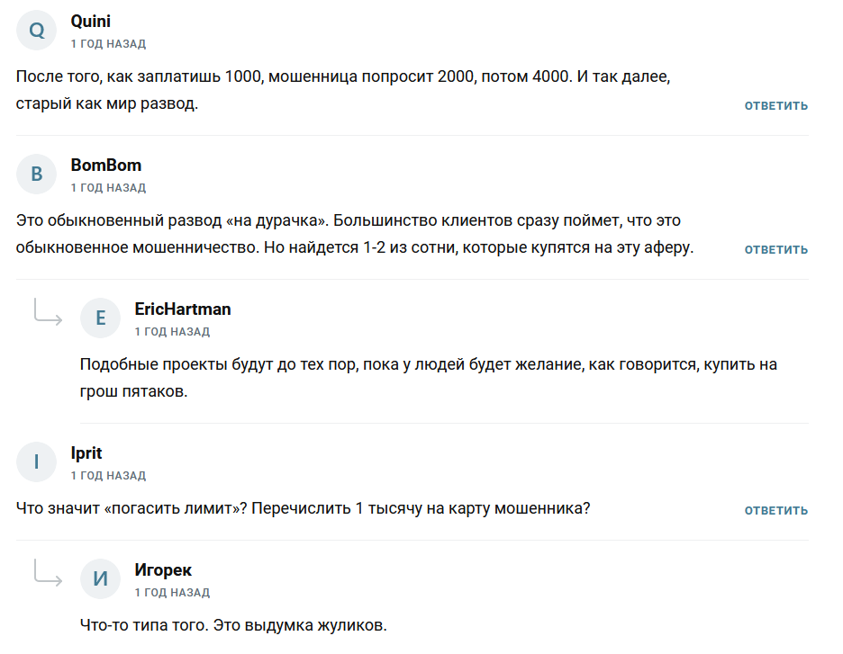 При этом у девушки отсутствуют документы, подтверждающие ее квалификацию. А раскрутку депозитов в Телеграме предлагают только мошенники. Все ее публикации содержат только громкие заявления, не подкрепленные фактами.Еще одна схема мошенничества в этом канале – это «доверительные инвестиции». Пользователи должны перевести Елизавете деньги на фейковые розыгрыши или погашение лимитов. При этом, если бы розыгрыши были настоящими, комиссия за перевод вычиталась бы из выигрыша. Однако этого не происходит, и деньги пользователей снова исчезают.
