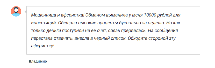 Схема всегда одна и та же – обещание большой прибыли без риска и усилий, просьба перевести ей деньги для инвестиций. Как только аферистка получает платеж, она либо пропадает, либо пытается выманить из жертвы побольше, требуя уплатить банковские комиссии, налоги и пр. Остерегайтесь подобных схем, в них заработать не получится.