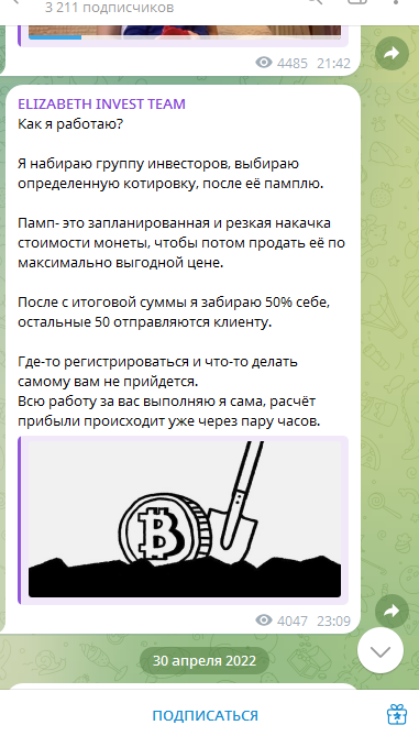 Elizaveta Invest Team — проект в ТГ, который предлагает сомнительную схему заработка на крипте. Мы изучили информацию о нет, отзывы инвесторов и пришли к выводам: