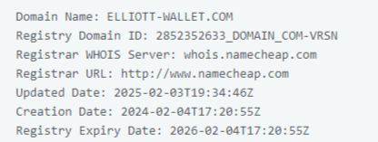 Дополнительно мы проверили характеристики домена elliott wallet com и выяснили, что запущен он был в феврале 2024 года. Странно, что за целый год работы проект еще нигде не получил упоминание.