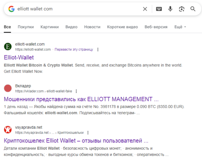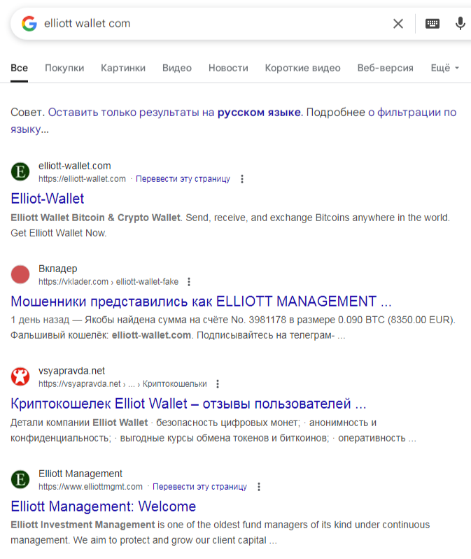 Если верить дате регистрации домена, то возраст организации Elliott Wallet Com – чуть больше года. Но странно, что за такое время в сети о нем не образовалось ни одного упоминания. Причем нет ни обзоров, ни разоблачений.