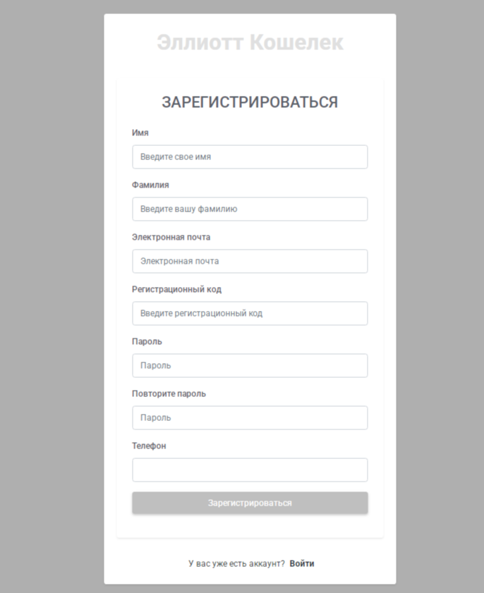 Чтобы зарегистрироваться на площадке elliott wallet com, нужно ввести стандартные данные, такие как фио, почта, пароль и сотовый номер. Также здесь требуется и регистрационный код. Но откуда пользователь должен его взять – непонятно.