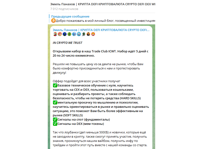 В ленте Эмиль Панахов | КРИПТА много отвлекающего информационного мусора. Какие-то фотографии с курортов, отелей, автомобилей. Все это – триггер для начинающих инвесторов. Цель Панахова – заманить клиентов в платный Телеграм-канал In Crypto We Trust с сигналами.