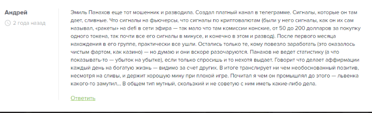 Большая часть пользователей, воспользовавшихся сигналами Эмиля Панахова, сообщают о значительных финансовых потерях. Если кто-то и получил доход, но это благодаря удаче, а не качественным сигналам. В конечном итоге, многие клиенты выражают недовольство действиями Панахова, называя их мошенническими. Он пишут, что его торговые сигналы часто приводят к сливу депозита.