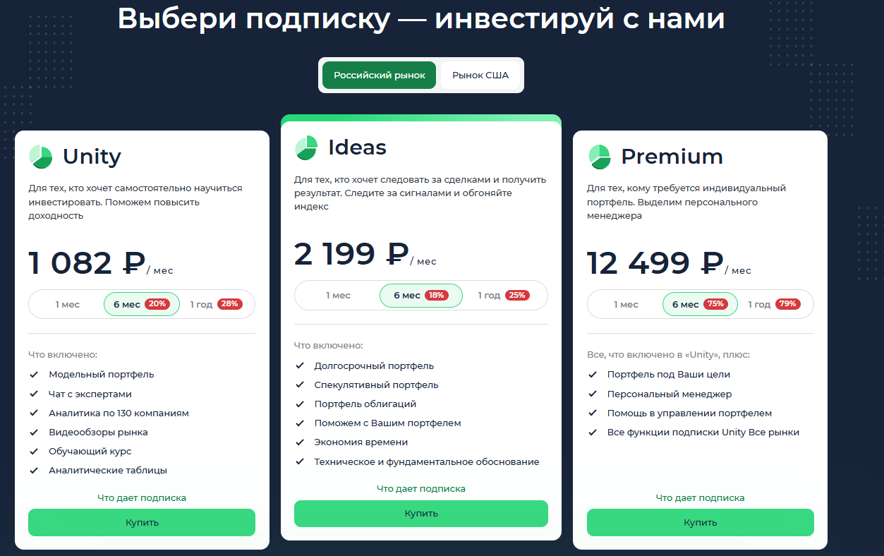 Минимальный тариф для инвестора оценивается в ₽1,082, а максимальный в ₽12,499. Также на сайте есть и другие продукты, от полезных инструментов и до обучения.