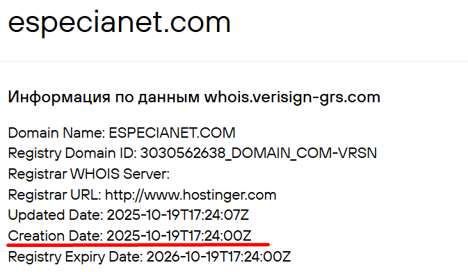 Согласно сервису Who is доменное имя Especianet com создано в конце октября 2025 года и на момент обзора площадка не проработала и несколько месяцев. При таких обстоятельствах о репутации проекта говорить и не стоит – ее просто нет. Основная страница на момент написания недоступна. Домен зарегистрирован на год, до октября 2026.