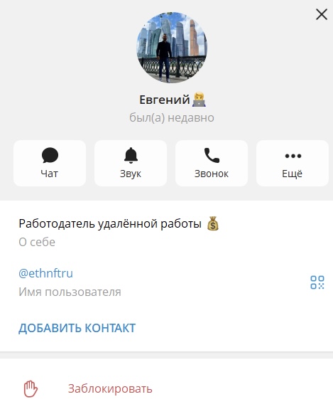 Ethnftru — это пользователь в Telegram, который предлагает услуги по раскрутке депозита через торговлю криптовалютами и NFT, а также позиционирует себя как работодателя для удаленного заработка без вложений со стороны соискателя.