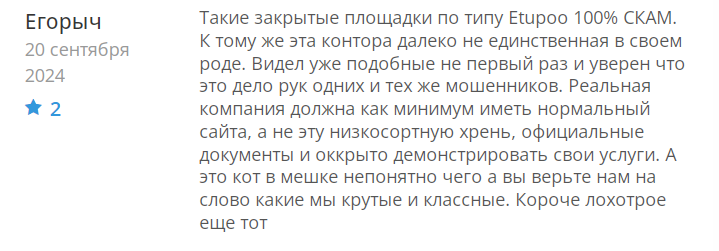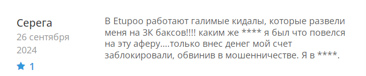 Ситуация с блокировками выглядит тревожно. Люди вносят деньги, а потом внезапно получают уведомление о заморозке счета. Причины выглядят надуманными. Несколько отзывов указывают на схожесть Etupoo с известными мошенническими схемами. Закрытость платформы, примитивный сайт и агрессивная блокировка недовольных клиентов — типичные признаки скама.