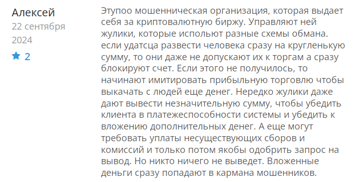 - Нет документов и лицензии — биржа работает непонятно как и кем, а пользователи жалуются на блокировки счетов и вымогательство дополнительных платежей за вывод денег.