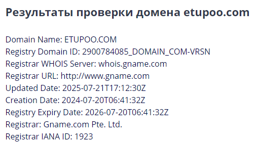 Криптобиржа Etupoo начала работу в июле 2024 года. Судя по данным whois, домен зарегистрирован через азиатского провайдера Gname.com. Платформа не раскрывает сведений о лицензировании, что сразу настораживает.