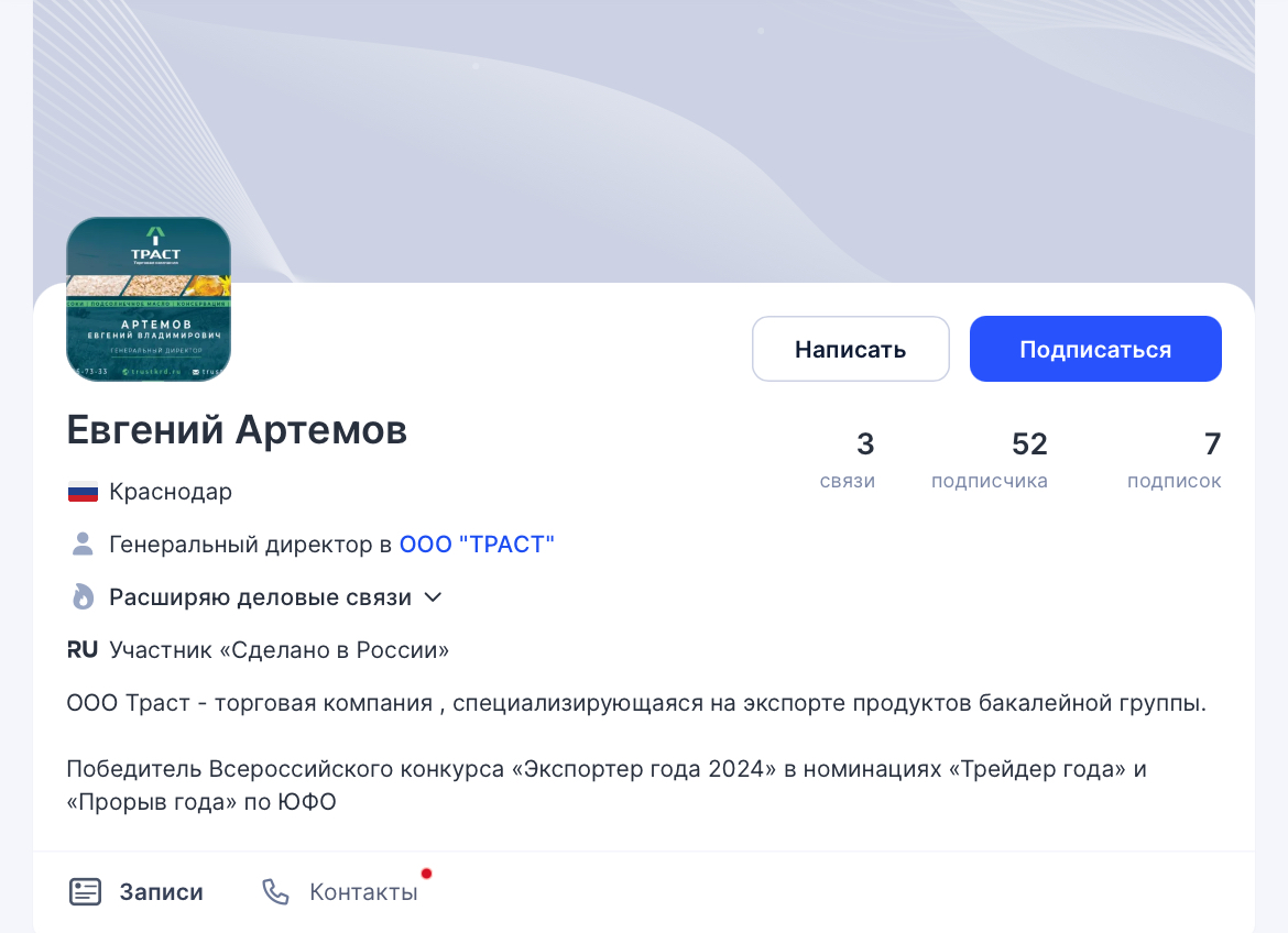 На платформе Tenchat есть подробная информация о директоре. Здесь есть его личная страница, где указывается должность Евгения и заслуги. О себе он пишет, что является членом проекта «Сделано в России» и расширяет деловые связи. Кратко есть и описание самой фирмы — компания занимается экспортом круп и зерен.
