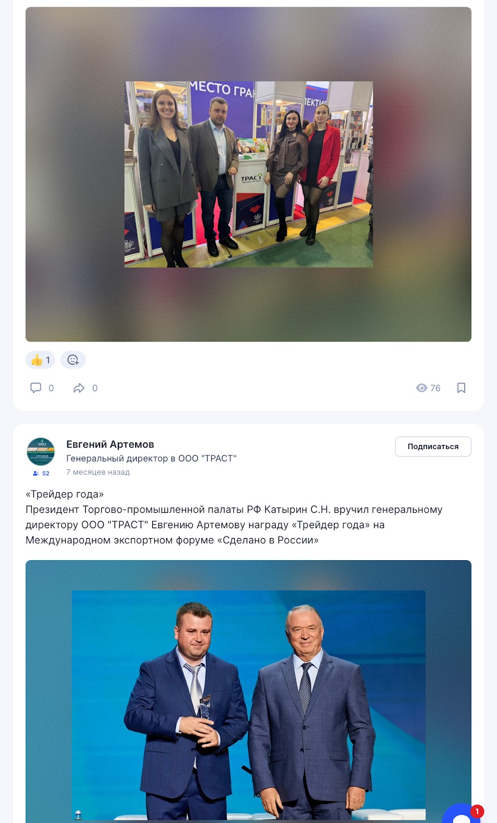 В ленте есть последние новости о директоре и самой фирме. Так, он пишет, получил награду «Трейдер года» от проекта «Сделаем в России». Посты набирают несколько лайков, что дополняет слабую популярность бизнесмена.