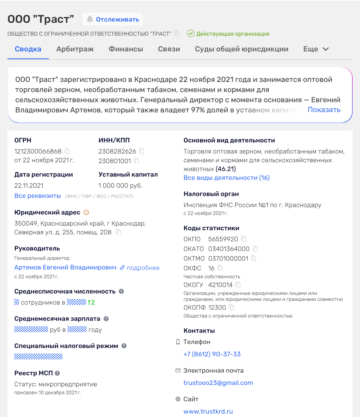 Мы проверили юридические данные фирмы «Траст». Она появилась 22 ноября 2021 годам а директор владеет 97% долей в бизнесе. Указаны данные ОГРН, ИНН, написан уставный капитал — 1 000 000 ₽. Состоит в налоговой, имеет актуальные номера и электронные адреса.