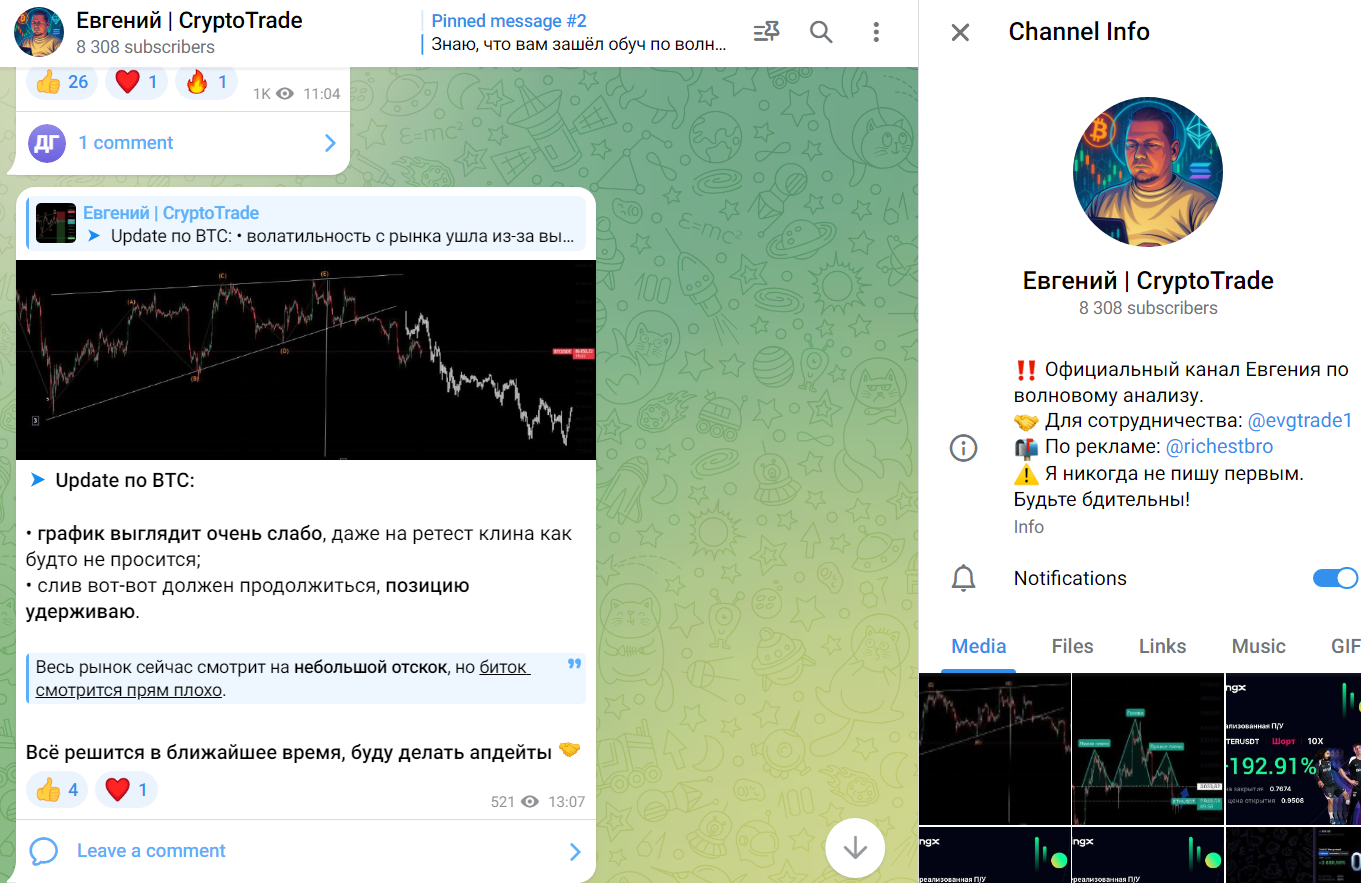 Евгений CryptoTrade — это сообщество в Телеграмме, посвященное анализу рынка цифровых валют и советам по торговле. Основатель проекта продвигает обучение по волновому анализу и обещает увеличение капитала с помощью рекомендаций. Далее мы расскажем про особенности тг-канала и условия получения образовательных материалов подробнее.