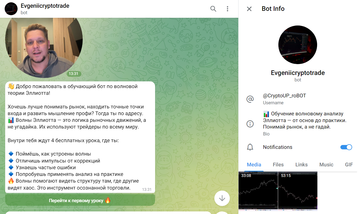 Трейдер предлагает запускать бота CrytptoUP roBOT для получения обучения по волновому анализу. По словам аналитика, пользователи могут бесплатно получить уроки, в рамках которых смогут: