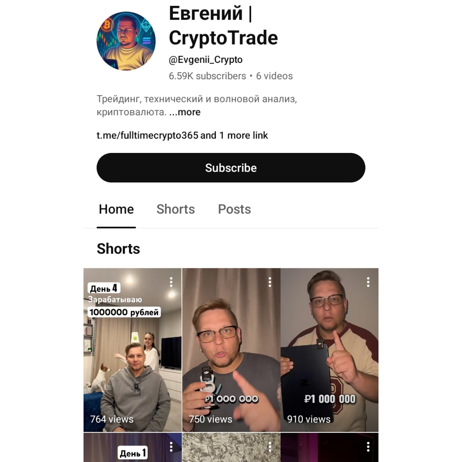 YouTube канал Evgenii Crypto ведется с 2024 года, и здесь 6.5k фолловеров.Опубликовано 6 видео в формате шортс, а их просмотры составляют до 1k. В роликах создатель рассказывает о собственном заработке на трейдинге.