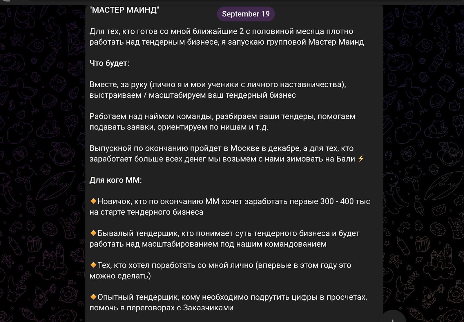 Для инвесторов, которые хотели бы посотрудничать с Евгением Гатиятуллиным лично, админ запускает групповой “Мастер Маинд”. Участникам обещают масштабирование тендерного бизнеса, очный выпускной, разбор тендеров и тд. Стоимость участия скрыта, узнать ее можно только в личные сообщения предпринимателю по нику @gatiyatullin_evgeny.