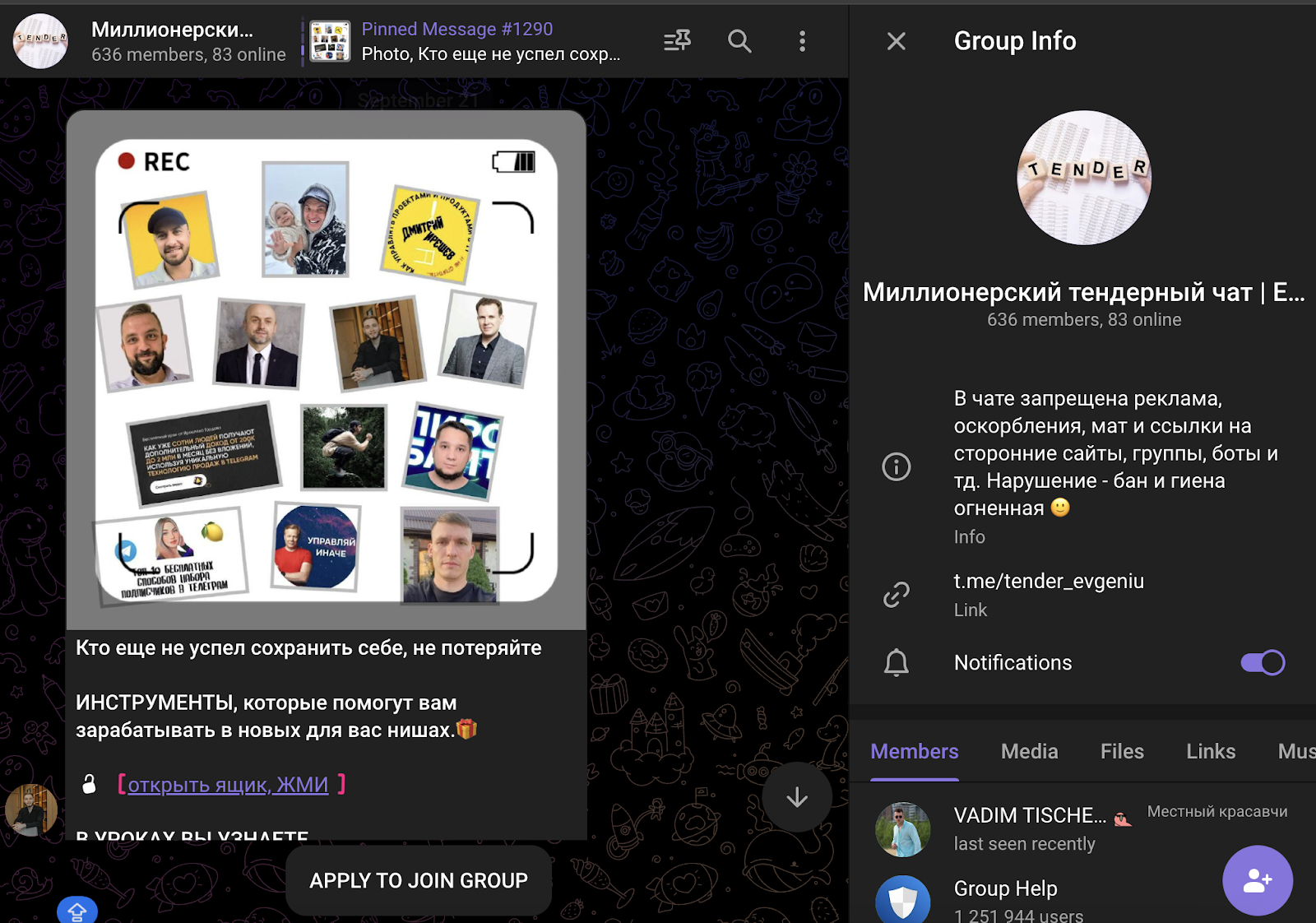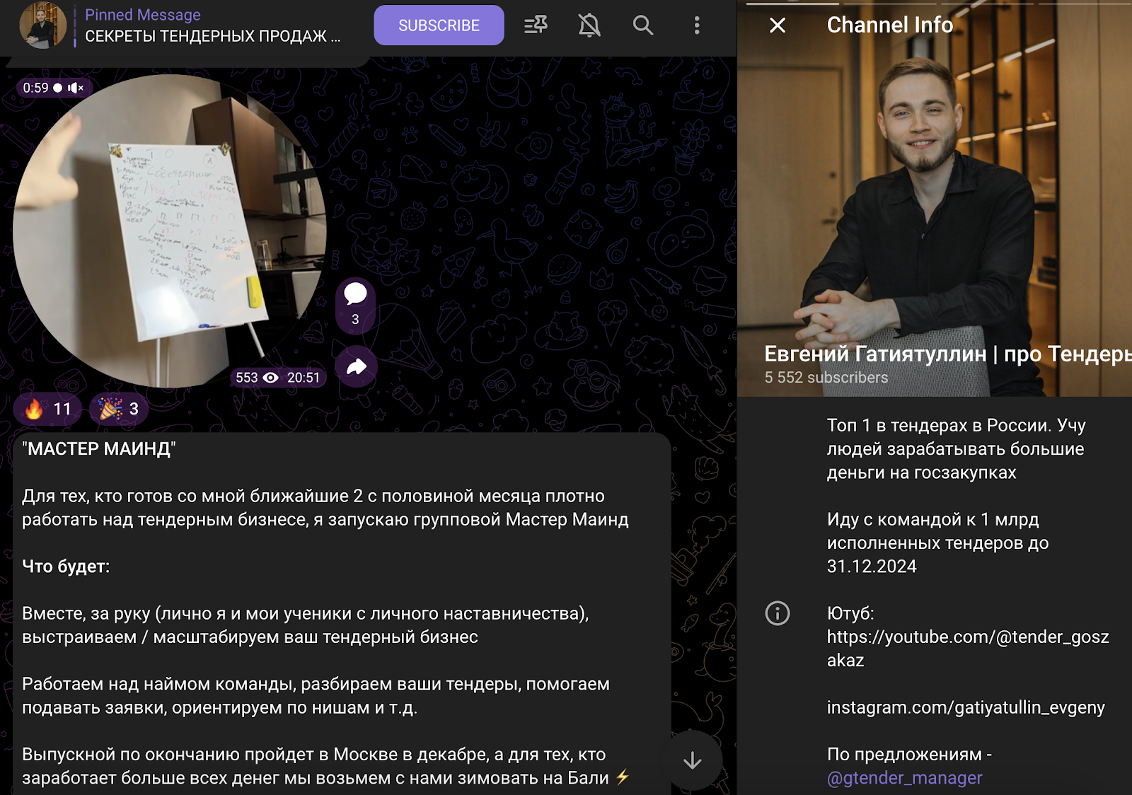 Инвестор продвигает проект сразу в нескольких социальных сетях. Помимо основного тг-канала, существует еще один: “Миллионерский тендерный чат Евгений Гатиятуллин” с ником tender_evgeniu, где полностью дублируется информация из основного тг-канала и у участников есть возможность обсудить посты.