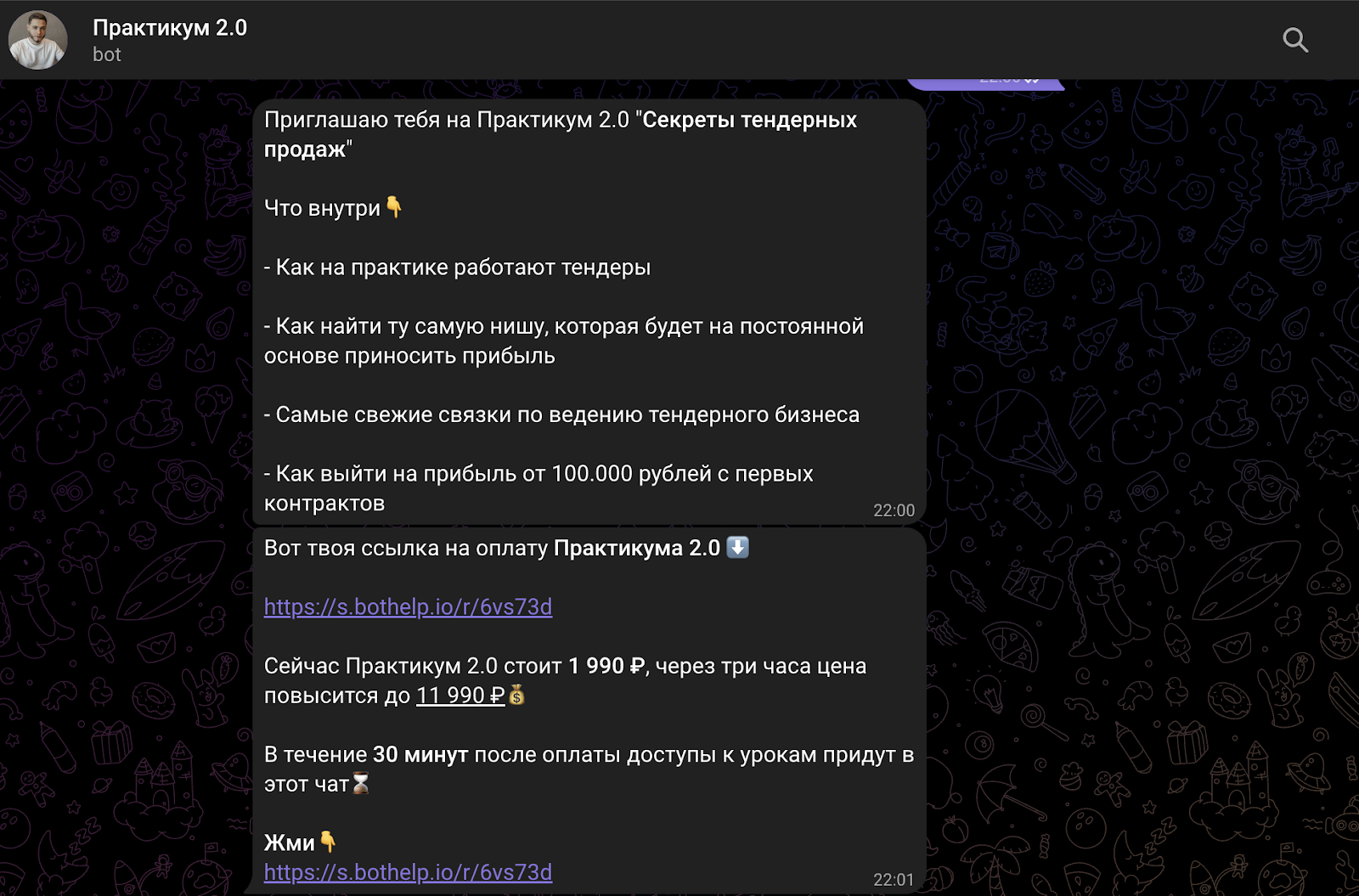 Получить доступ к обучающим материалам возможно только после произведения оплаты в размере 1990 рублей. При этом в сообщении подчеркивается, что через 3 часа цена курса достигнет 11 990 рублей. В курс включены правила поиска прибыльной ниши, свежие тендерные связки и тд.
