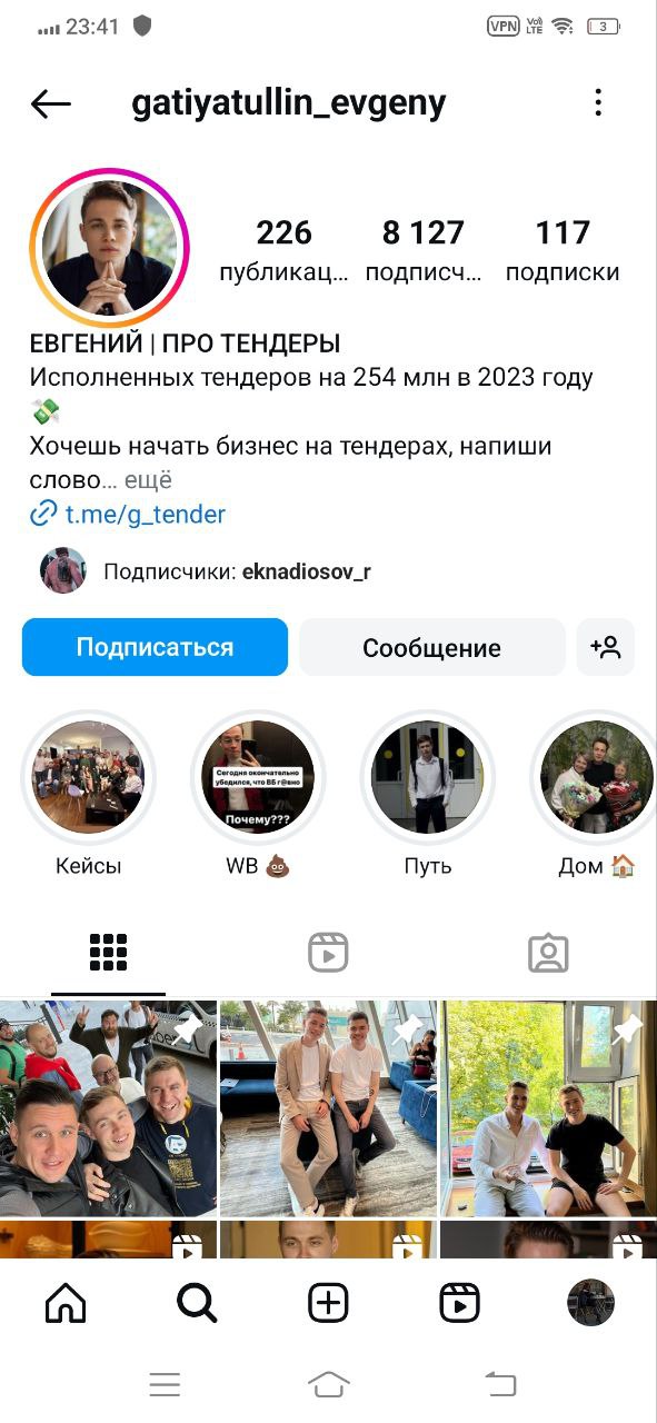 Евгений активно ведет страницу в Инстаграмм “Евгений про тендеры” с ником gatiyatullin_evgeny .