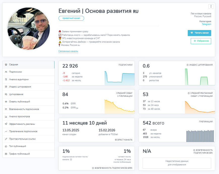 Телеграм-канал Евгения работает около года. Аудитория в проекте на данный момент составляет уже почти 24 тысячи человек, что является отличным показателем. Вот только при изучении статистики становится понятно, что реальных пользователей здесь очень мало, если они вообще есть. Подписчики явно накручены, публикации просматривает не более 100 человек. В канале закрыты комментарии, а также отсутствует возможность оставить реакции под постами. Это лишает нас возможности увидеть, как реально аудитория относится к контенту.
