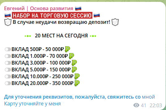 Торговые сессии Евгений проводит каждый день. Количество мест всегда ограничено. Как правило, трейдер указывает, что готов принять 20 позиций. Минимальное вложение – 500 рублей. За такой небольшой вклад Евгений обещает выплатить 50 тысяч рублей. Звучит совершенно нереально, да и на деле выглядит точно также. Торговая сессия длится несколько часов, выплаты пользователи якобы получат уже на следующий день. За свои услуги Евгений всего лишь берет небольшой процент. Однако, берет он его только в случае успешно проведенной сделки. Если торговая сессия завершилась неудачно, то трейдер возвращает подписчикам все в полном объеме.