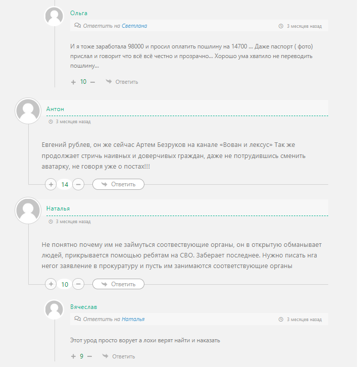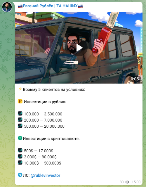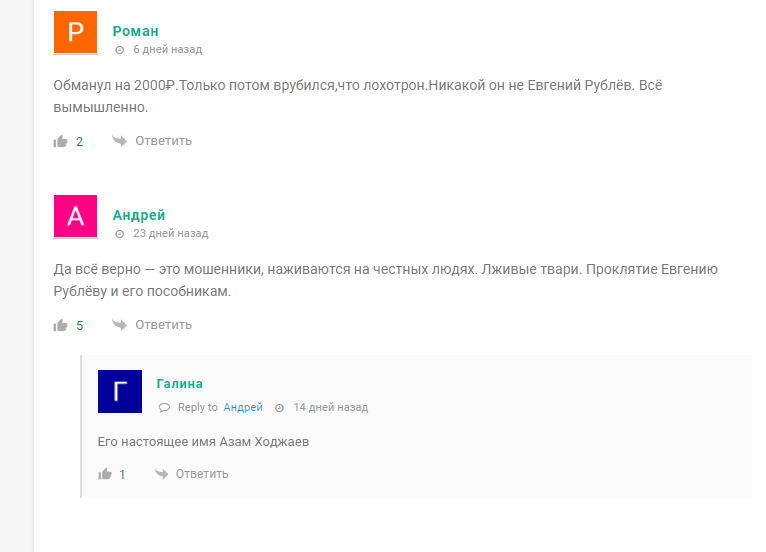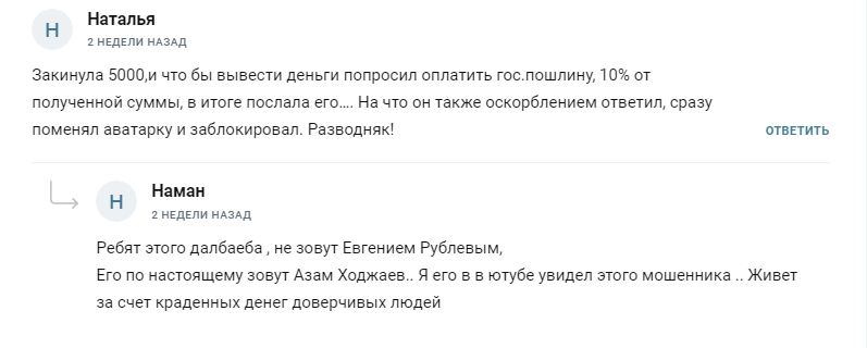 Отзывы об инвесторе Евгении Рублеве в сети крайне негативные. Афериста зовут Азам Ходжаев, его нашли пострадавшие на одном из Ютуб каналов. Его доход — средства, которые клиенты переводят в качестве депозитов. Никаких пампов он не проводит, помимо первоначального взноса требует с клиентов оплаты расходов на комиссии, страхование вклада, процент за собственные услуги, налоги и пр. Еще одна из ролей мошенника — Артем Безруков, проект Вован и Лексус. На это указывают в отзывах о Евгении Рублеве в Телеграм. Таким образом количество каналов, где работает этот аферист, может быть гораздо больше, чем удалось отыскать. Разница в условиях работы только в сумме депозита, где-то это 1-2 тысячи, а где-то сразу 100 000 рублей. Вывод однозначный, заработок с Евгением Рублевым — обман.