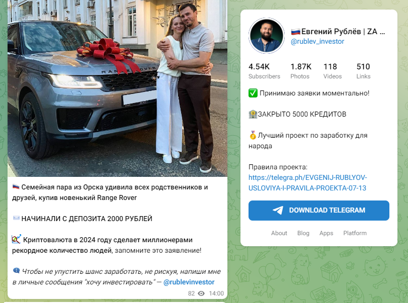 Проект Rublevinvestor — мошенничество, развод на деньги. Редакция предупреждает пользователей, что сотрудничество с инвестором приводит к крупным финансовым потерям. В отзывах о telegram канале Евгения Рублева правда о схеме мошенника раскрыта пострадавшими клиентами, которых уверяли в безопасности сотрудничества. Некоторых пытались загнать в долги и кредиты. Своими отзывами о канале Евгения Рублева в Телеграм вы можете поделиться в комментариях под обзором Rublevinvest.