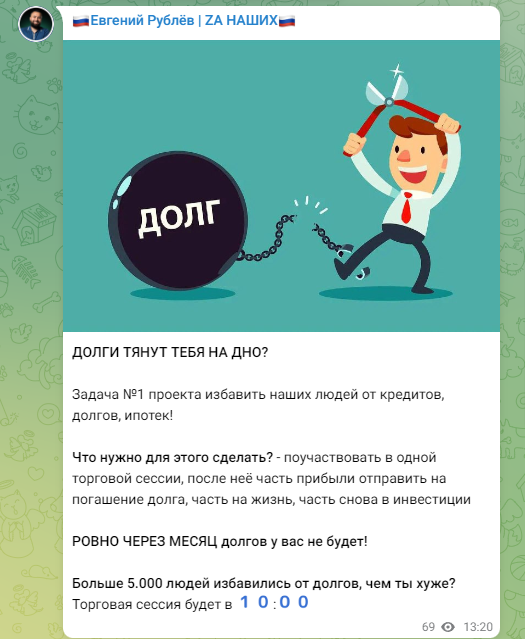 Инфоциган, трейдер Евгений Рублев в своем Телеграмм канале вещает на аудиторию около 4,5 тысячи пользователей. У него есть еще несколько площадок, количество накрученных ботов везде разное, на некоторые каналы подписано более 30 тысяч пользователей. Вычислить реальных подписчиков не сложно, читает контент 50-100 человек. Комментировать публикации нельзя, оставлять к ним реакции тоже запрещено. Посты дублируют во все каналы, уникальности и пользы в них нет. Контент содержит много мотивационных цитат, отзывы довольных клиентов, а также рекламу услуг инвестора. Биографию Евгений Рублев излагает скупо, придумывать подробную легенду не стал, ограничившись заявлением, что сделал миллиарды на пампах крипты. В ТГ лохотроне Евгения Рублева нет доказательств, что автор проекта действительно торгует на бирже.