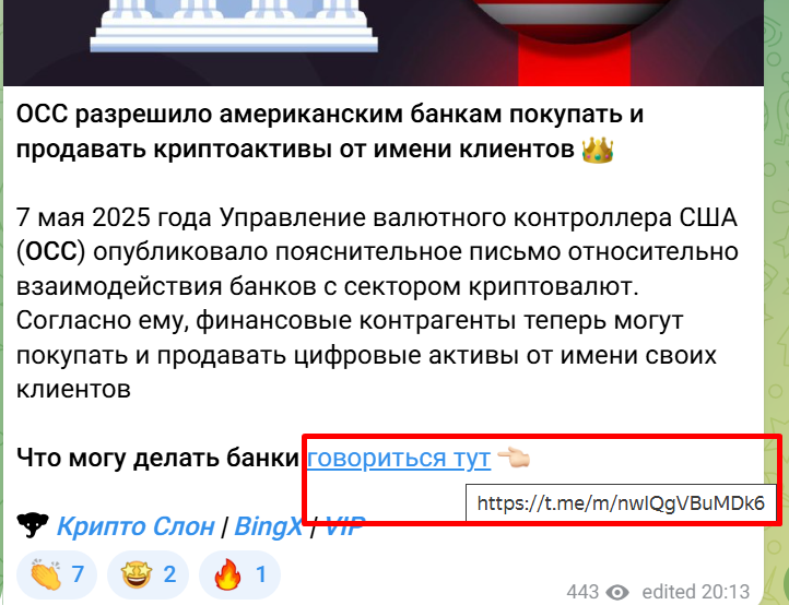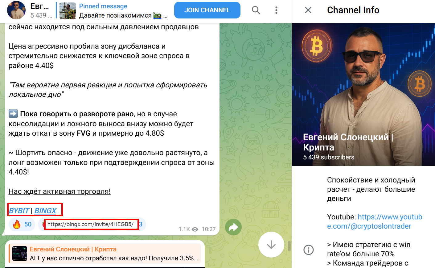 Общая публика канала насчитывает свыше 5,4 тыс. участников, при этом записи смотрят несколько сотен. Индикатор просмотра отдельных новостей накручен свыше тысячи. Комментарии закрыты и реальную активность фолловеров не узнать. К каждой своей записи автор проекта добавляет реферальные ссылки на две сомнительные биржи – Bybit и BingX.