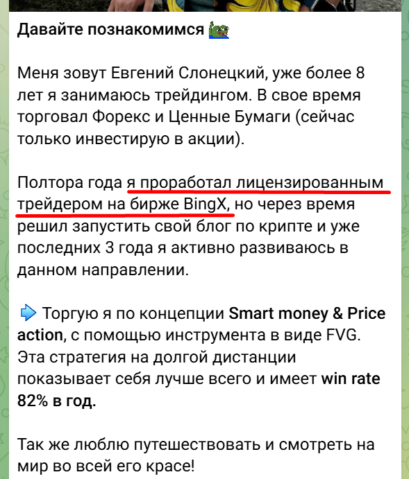 Через несколько месяцев Евгений все же решил познакомиться со своей аудиторией, сообщив, что проработал лицензированным трейдером на бирже BingX, а общий стаж его активности в торговле криптовалютой превышает 8 лет. На текущий момент Евгений якобы только инвестирует в акции. К личным рассказам о любви к путешествиям прикладываются фото на фоне красивых локаций. Впрочем, редко какой канал крипто мошенников обходится без таких изображений и проверять трейдера нужно только по фактам о его деятельности.