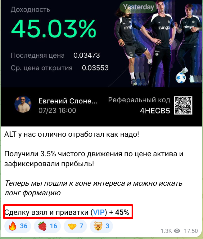 Упомянув о наличии лицензии, Евгений забыл показать скан самого документа, а также предоставить ИНН, по которому можно было бы проверить финансового консультанта в каталоге Центробанка. Помимо отсутствия лицензии, нет также и верифицированной статистики сделок с торговой площадки. Вместо них Евгений усердно рисует проценты прибыли в картинках, не забывая выкладывать свой реферальный код и продвигать VIP-сообщество. Чтобы не прогадать на минимальных вложениях клиентов, Евгений сразу оговаривает – работа с ним ведется от стартовой цены в 100 долларов за сопровождение сделок и получения сигналов в закрытом комьюнити. Минималка для внесения депозита на биржу составляет 200 долларов.