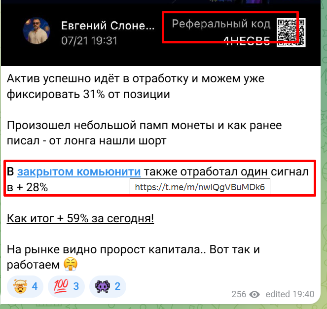 Закрытое комьюнити, созданное трейдером без подтверждения его реальной деятельности на крипторынке – это шанс поделиться всем своим депозитом с мутной биржей по фейковым сигналам трейдера. Впрочем, Евгений скажет своим подписчикам за это только “Спасибо”, так как биржа выплатит ему процент – ведь именно он, ее партнер, является поставщиком новых жертв финансового обмана.