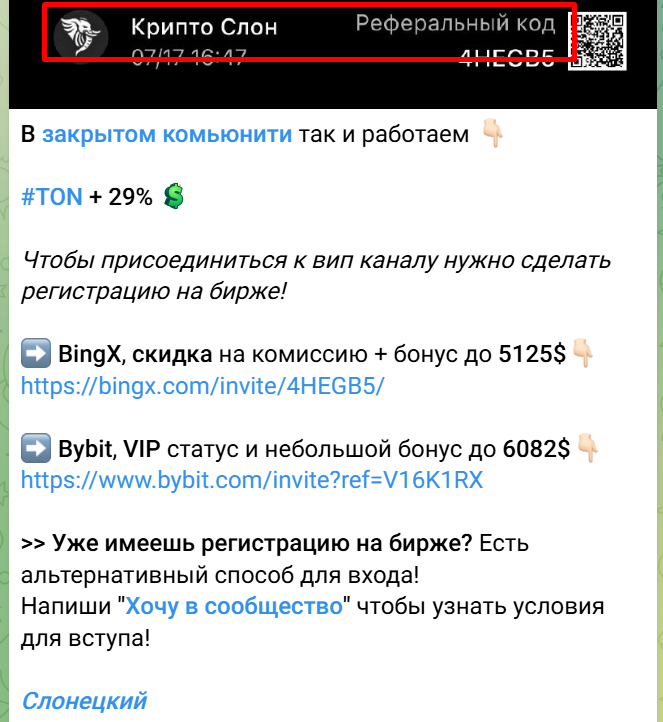 Ни лицензии, ни проверенной истории сделок, а только утверждения о наличии топовой команды и самохвальство – оплату за наставничество хочет взять трейдер без подтвержденной квалификации и партнер двух сомнительных бирж. Жалобы на Bybit и BingX можно найти на самых различных независимых ресурсах. Пользователи жалуются на необоснованную блокировку аккаунтов и заморозку депозитов. Однако Криптослон, якобы поработав с площадками, все еще их рекомендует. Советы такого ментора заведут подписчиков в денежный капкан.