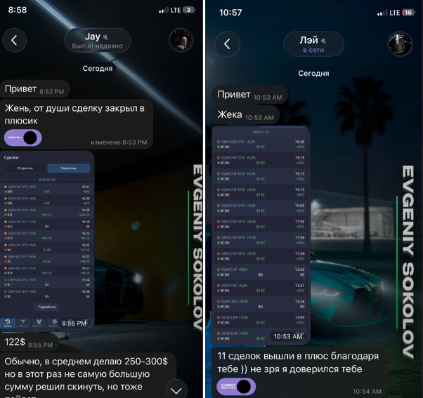 Evgeniy Sokolov Телеграм – трейдер, предлагающий доход на копировании сделок. Ведет собственный блог с бесплатной информацией, предлагает вступление в VIP клуб. Зарабатывает на опционах, приглашает потенциальных клиентов вступить в команду для совместных сессий. Но успешность Евгения вызывает сомнения, подписчики негативно отзываются о его профессионализме.