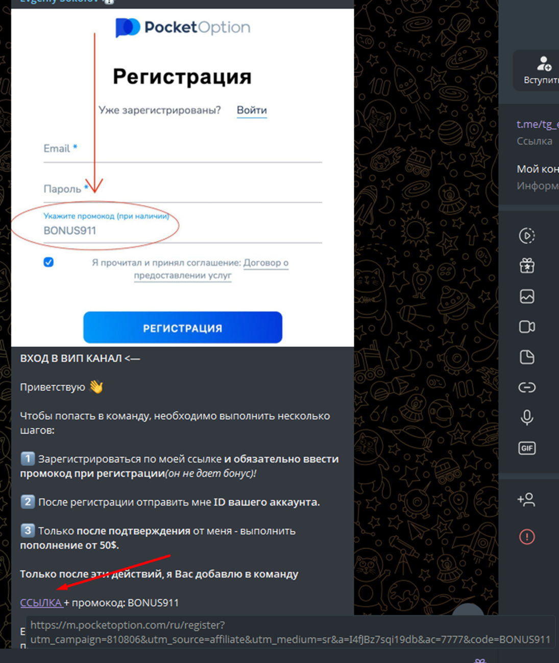 Платные услуги не рекламируются, автор всячески подчеркивает, что вход в ВИП канал бесплатный. Но при этом ставит условие – обязательная регистрация на PocketOption по его реферальной ссылке. В личном кабинете надо указать промокод, затем пополнить счет минимум на 50 у.е. Только в этом случае трейдер одобрит участие в Приватном Клубе.