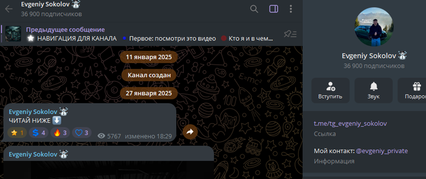 Канал Evgeniy Private в Телеграмме был создан в январе 2025 года, насчитывает более 36,9 тысяч подписчиков. Но это число плохо коррелируется с количеством просмотров постов и реакций читателей. Такая ситуация характерна для накрутки и имитации активности на канале.
