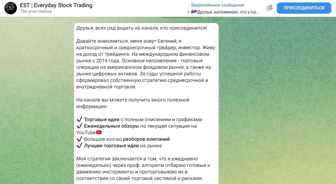 Евгений Тарасов – трейдер, блогер, развивает канал в Телеграме EST | Everyday Stock Trading. Работает с акциями и опционами. В ленте публикует новости, аналитику, редко сигналы. Платная услуга — обучение трейдингу и индивидуальные консультации. Вряд ли финансист может чему-то научить пользователей, поскольку у него нет дипломов или сертификатов.