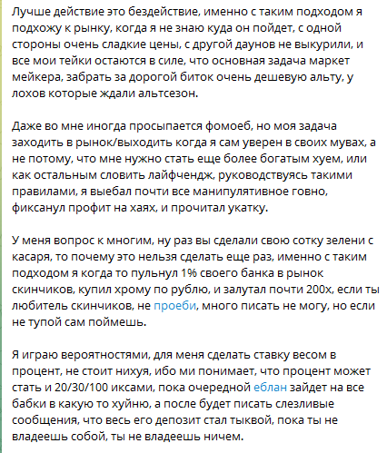 Остерегайтесь «трейдера» Факича! Внешне всё выглядит убедительно: позитивные отзывы, активность в Telegram. Но платная подписка — полный разочарование: никаких рабочих схем, только пустые обещания о «гарантированной» прибыли. Самая глупая трата денег.