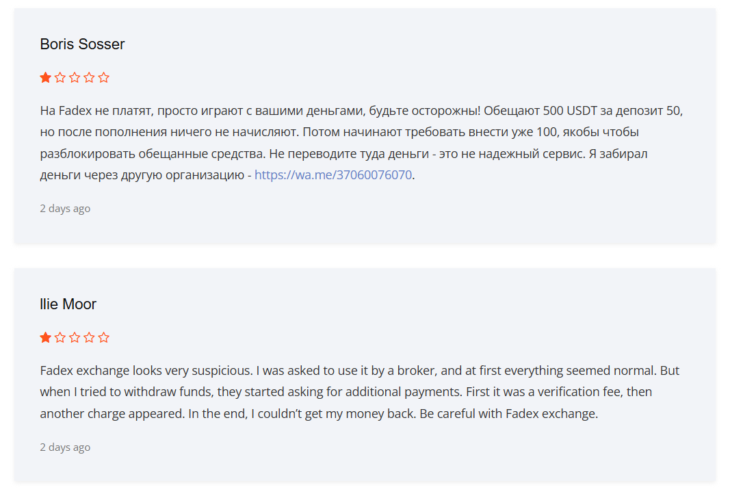 Обзор криптобиржи Fadex показал, что работать с ней нельзя. Платформа явно принадлежит мошенникам. Она действует полностью анонимно, на сайте нет сведений ни о разработчиках, ни о самой компании. У биржи нет лицензии. К тому же, репутация у проекта уже плохая. Чтобы не стать жертвой очередных скамеров, следите за нашими обзорами, мы рассказываем обо всех мошеннических схемах.