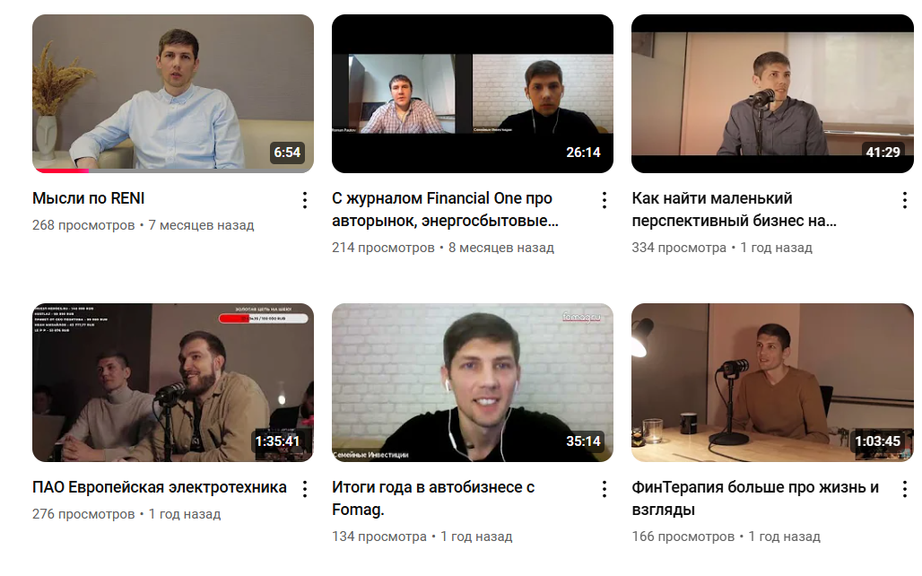 Также автор ведет свою ютуб-канал, на который подписано всего 200 человек. Ролики набирают не много просмотров. В среднем видео смотрит 200-300 пользователей. основной контент — анализ отдельных акций, интервью и небольшие подкасты. Сейчас канал заброшен, последний раз автор опубликовал видео 7 месяцев назад.