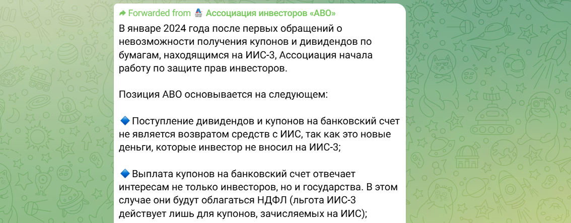 Также здесь есть новости из жизни автора и некоторые полезные новости. Например, здесь Сергей репостнул пост из канала Ассоциации Инвесторов, который призывает инвесторов писать обращения в Администрацию Президента: