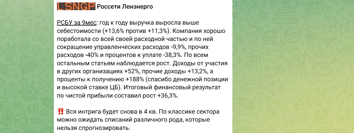 Основной контент в канале — анализ отдельных акций. Иногда familyinvestments1 пишет про текущие события в мире и свои идеи относительно фондового рынка. Например, в этом посте Сергей рассказывает про Ленэнерго.